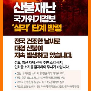 산불 재난 국가위기경보 ‘심각’ 단계 발령 중입니다.전국 곳곳에서 대형 산불이 발생하고 있습니다.작은 부주의가 한순간에 대규모 피해로 이어질 수 있습니다.모든 시민 여러분께서는…