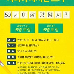 광명시(시장 박승원)는 오는 28일부터 시니어 세대의 활력 증진과 사회 참여를 돕기 위해 ‘자서전 쓰기 강좌’ 참가자를 모집한다.철산도서관은 2022년부터 시니어 세대가 독서와…
