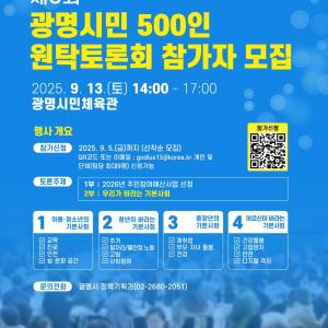 광명시(시장 박승원)가 ‘시민 의견이 곧 정책이 되는 도시’를 목표로 시민 500명과 함께 기본사회 청사진을 그린다.시는 오는 9월 13일 광명시민체육관에서 시민과 함께 지역의…