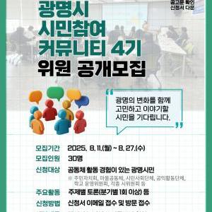 광명시(시장 박승원)는 11일부터 27일까지 시민과 함께 정책 해법을 찾는‘시민참여 커뮤니티’ 4기 위원을 모집한다.시민참여 커뮤니티는 시민 눈높이에서 다양한 지역문제를 논의하고…