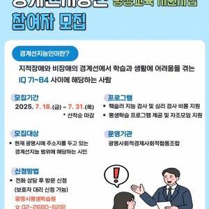 광명시(시장 박승원) 평생학습원은 18일부터 31일까지 2주간 경계선지능인 평생학습 프로그램 ‘천천히, 함께 자라는 우리’ 참여자를 모집한다.경계선지능인이란 지능지수(IQ) 71…