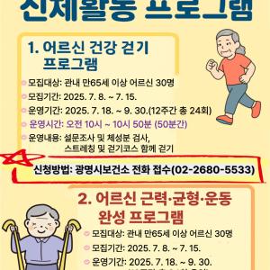 광명시(시장 박승원)는 오는 8일부터 15일까지 어르신의 건강한 일상 유지를 돕기 위한 ‘제2기 어르신 신체활동 프로그램’ 참여자를 선착순 모집한다.이번 프로그램은 만 65세…