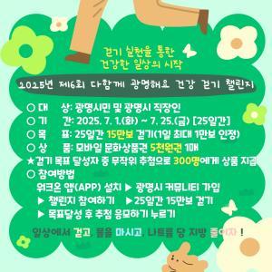 광명시(시장 박승원)는 시민의 건강한 생활습관 형성과 만성질환 예방을 위해 7월 1일부터 25일까지 ‘2025년 제6회 다함께 광명해요 건강 걷기 챌린지’를 운영한다.이번…