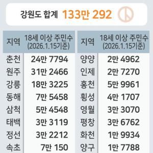 6월 3일 실시되는 제9회 전국동시지방선거의 18세 이상 강원지역 선거인수는 133만292명으로 집계됐다.이는 앞선 2022년 제8회 지방선거(133만 6080명