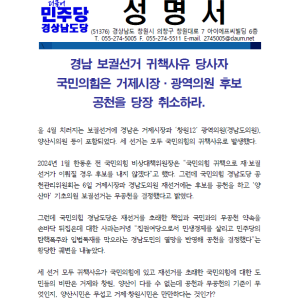 더민주 경남도당 - 국힘은 거제시장.광역의원 후보 공천을 취소하라!