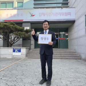 정영두 전 노무현 정부 청와대 행정관이 제9회 전국동시지방선거 경남 김해시장 예비후보로 등록했다. 정 예비후보는 시장 선거 예비후보 등록 첫날인...