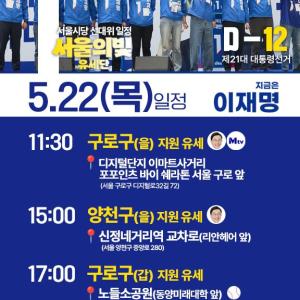 📢 5월 22일 (목)! '서울의빛 유세단', 11일차 출동! 📅[D-12 | 5월 22 목요일, 유세 일정은?] 📍오전 11시 30분 – 디지털단지 이마트사거리 포포인츠 바이…