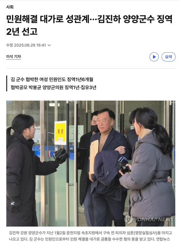 민원인으로부터 금품을 수수하고 부적절한 행위를 한 혐의로 기소된 김진하 강원 양양군수가 1심에서 징역 2년의 실형을 선고받았다.