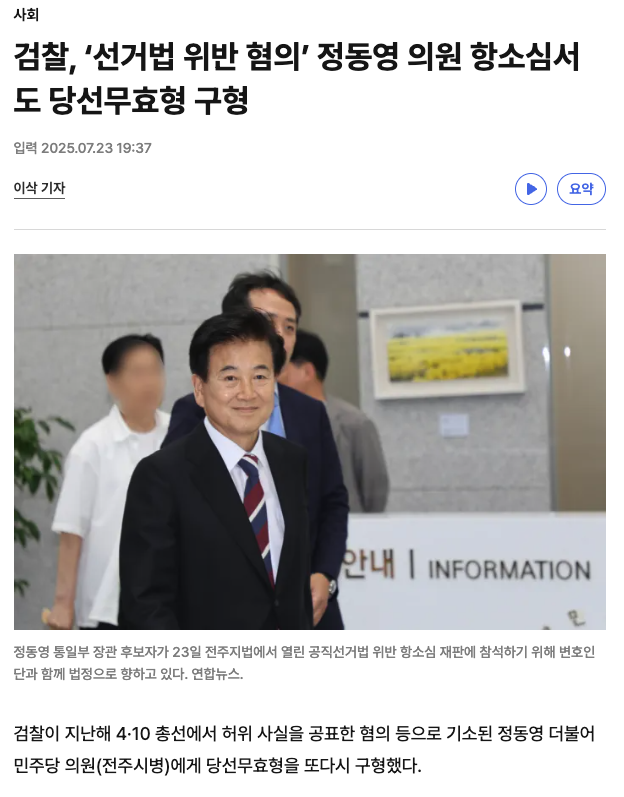 검찰, ‘선거법 위반 혐의’ 정동영 의원 항소심서도 당선무효형 구형