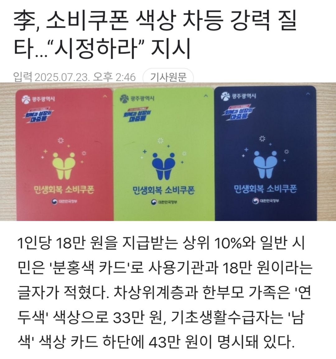 색깔별 소비쿠폰...인성이 느껴지지 않는 행정이다. 광주가 이정도 였나..