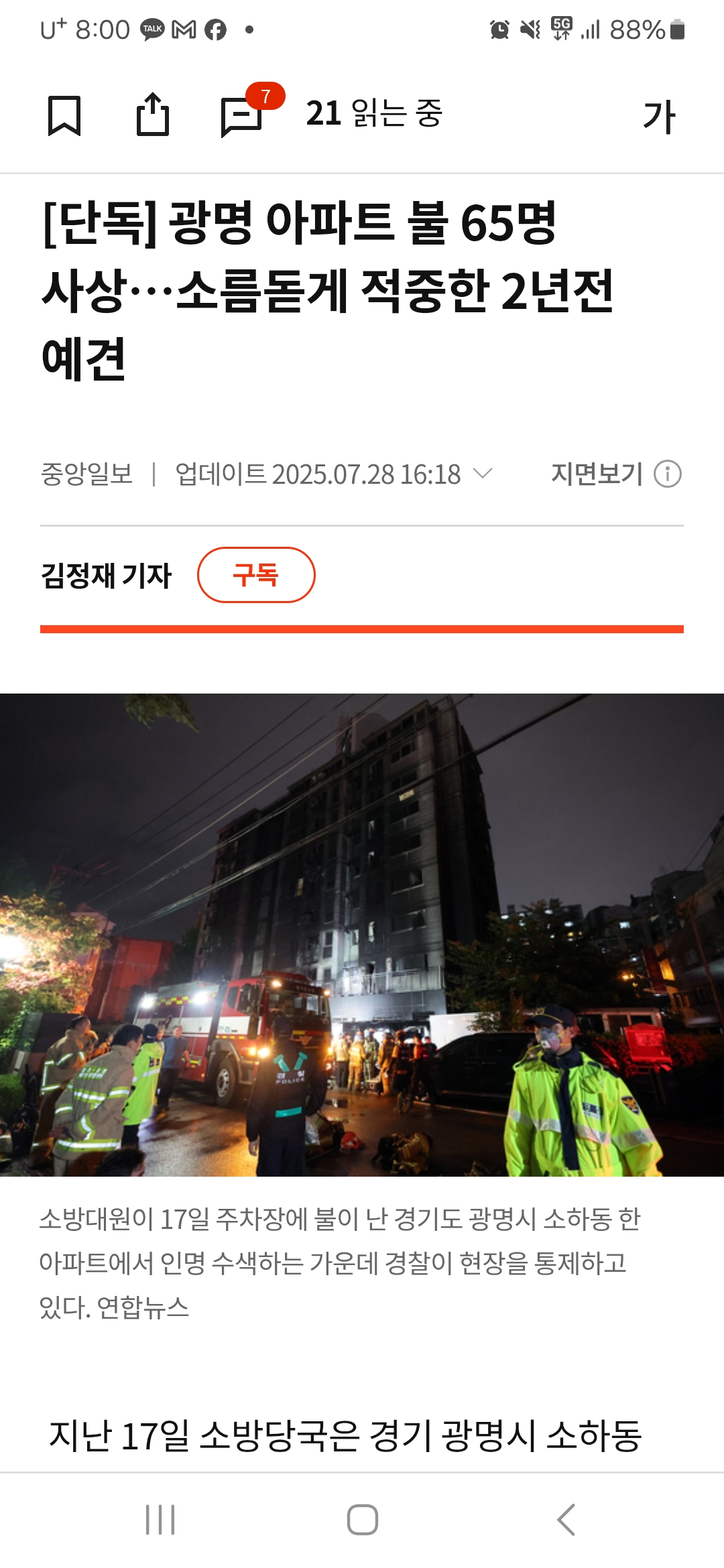 [중앙일보 단독] 광명 아파트 불 65명 사상…소름돋게 적중한 2년전 예견