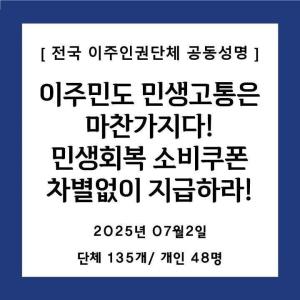 이주민도 민생고통은 마찬가지! 민생회복 소비쿠폰 차별없이 지급하라!