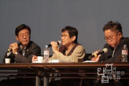 ▲ 이재명 성남시장(좌측부터)과 박한용 민족문제연구소 실장, 노기환 MC가 27일 경기도 고양시 문예회관 공연장에서 토크쇼를 진행하고 있다.