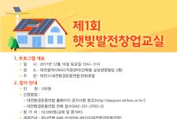 깨끗하고 풍부한 햇빛을 이용한 태양광 발전은 온실가스를 배출하지 않는 친환경 재생에너지입니다. 우리가 집과 동네에서 태양광을 세우고 스스로 전기를 공급할 수 있는 장점은 큰 매력입니다. 태양광이 어느 때보다 각광을 받고 있는 지금, 소형 ‘베란다 태양광’부터 발전사업에 이르기까지 시민들이 다양한 방식으로 태양광을 폭넓게 접하고 있습니다. 태양광 발전사업 육성과 일자리 창출을 위하여 대전시, 한화큐셀, 대전환경운동연합이 함께하는 ‘제1회 햇빛발전창업교실’에 참가자 여러분을 모십니다.