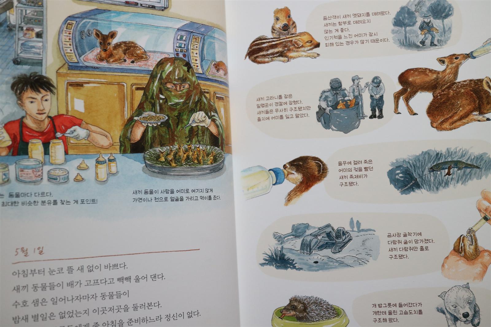 차에 치어 어미를 잃고 폐가에서 울고 있었던 새끼 삵, 할머니로부터 쥐 인줄 알고 빗자루에 머리 맞은 쇠족제비, 밀렵꾼들이 쳐놓은 덫에 다리를 다친 노루, 쥐를 잡다 축사 똥통에 빠진 수리부엉이, 공사장에서 삽에 찍힌 구렁이…, 다양한 동물들이 여러 가지 사연으로 치료실에 들어오면 각각에 맞는 보금자리를 만들어 주고, 다리 다친 노루를 수술하고, 젖병 조차 빠는 힘이 없는 새끼 삵에게 주사기로 분유를 먹이며 하나의 생명을 살리기 위해 분주하게 움직이는 주인공 ‘협’과 ‘수호’ 샘은 어린들에게 멋진 영웅처럼 느껴질 것 같다.