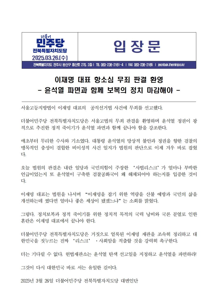 수, 2025/03/26- 00:00 에 admin 에 의해 제출됨 관련 개인/그룹 민주당 전북도당 정당 더불어민주당 지역 전북 카테고리 보도자료·성명·논평 250326_ [입장문]_이재명_당대표_항소심_무죄.hwp 링크 https://jeonbuk.theminjoo.kr/party/sub/news/view.php?brd=60&post=1612&board_id=briefing Like 0 Dislike 0 댓글 달기 이름 제목 Comment 저장 Preview Leave this field blank