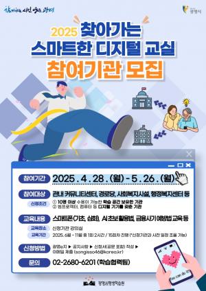 광명시(시장 박승원)는 오는 5월 26일까지 ‘찾아가는 스마트한 디지털 교실’ 사업 참여기관을 모집한다.‘찾아가는 스마트한 디지털 교실’은 디지털 접근성이 어려운 어르신을 위해 지역 커뮤니티센터, 경로당, 동 행정복지센터, 사회복지시설 등에 디지털 활동가 3명을 파견해 1:1 맞춤형 현장 중심 디지털 교육을 제공하는 프로그램이다.교육 내용은 ▲스마트폰 기능 활용법 ▲스마트폰 앱 이용법 ▲금융사기 대처법과 예방법 ▲AI 초보 활용법 등으로, 생활 속에서 꼭 필요한 디지털 역량을 쉽게 배울 수 있도록 지원한다.신청 자격은 10명 이상의