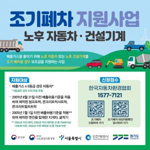 광명시(시장 박승원)는 대기환경 개선과 시민 건강 보호를 위해 ‘노후자동차 조기폐차 지원사업’을 추가 접수한다고 1일 밝혔다.이번 추가 접수는 예산 소진 시까지 진행하며, 소상공인은 4대부터 9대까지, 저소득층은 2대까지 추가 보조금을 지원한다.지원 대상은 ▲배출가스 4·5등급 경유차 ▲2009년 8월 31일 이전 배출허용기준을 적용받아 제작된 도로용 3종 건설기계(덤프트럭, 콘크리트믹서트럭, 콘크리트펌프트럭) ▲2004년 12월 31일 이전 배출허용기준을 적용받아 제작된 지게차·굴착기다.단, 접수일 기준 대기관리권역 또는 광명시에