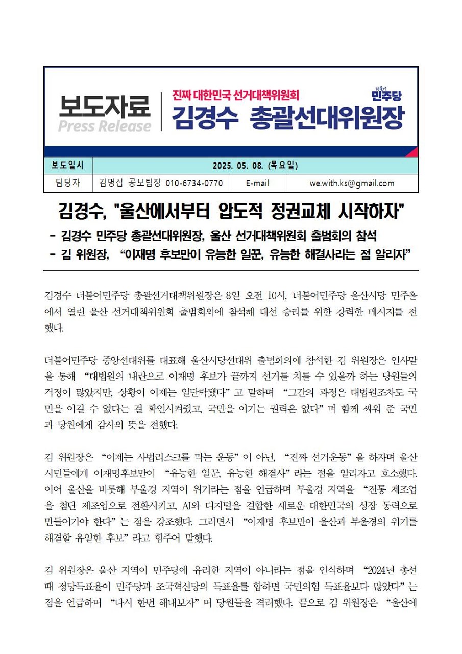 목, 2025/05/08- 00:00 에 admin 에 의해 제출됨 [0] 관련 개인/그룹 민주당 중앙당 정당 더불어민주당 지역 미특정 카테고리 보도자료 250508_보도자료_김경수_위원장_울산시당_출범식_참석.pdf공유 공유하기 닫기페이스북트위터카카오톡URL 복사 링크 https://theminjoo.kr/main/sub/news/view.php?sno=0&brd=188&post=1211130&search= Like 0 Dislike 0 1 view 댓글 달기 이름 제목 Comment 저장 Preview