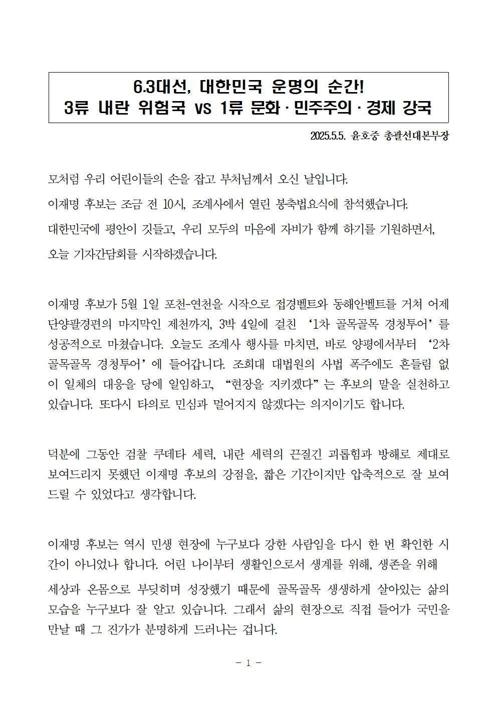 월, 2025/05/05- 00:00 에 admin 에 의해 제출됨 [0] 관련 개인/그룹 민주당 중앙당 정당 더불어민주당 지역 미특정 카테고리 보도자료 250505_기자간담회_윤호중_총괄선대본부장_모두발언(최종).pdf공유 공유하기 닫기페이스북트위터카카오톡URL 복사 링크 https://theminjoo.kr/main/sub/news/view.php?sno=0&brd=188&post=1211048&search= Like 0 Dislike 0 댓글 달기 이름 제목 Comment 저장 Preview