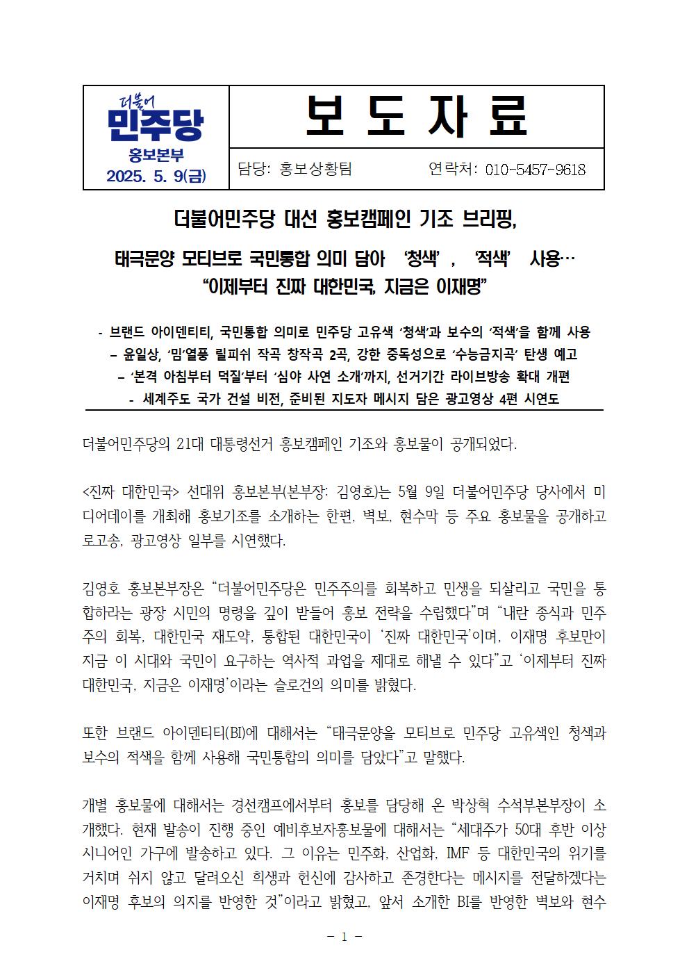 금, 2025/05/09- 00:00 에 admin 에 의해 제출됨 [0] 관련 개인/그룹 민주당 중앙당 정당 더불어민주당 지역 미특정 카테고리 보도자료 홍보본부홍보캠페인_기조_브리핑_미디어데이_보도자료최종.pdf공유 공유하기 닫기페이스북트위터카카오톡URL 복사 링크 https://theminjoo.kr/main/sub/news/view.php?sno=0&brd=188&post=1211154&search= Like 0 Dislike 0 12 views 댓글 달기 이름 제목 Comment 저장 Preview