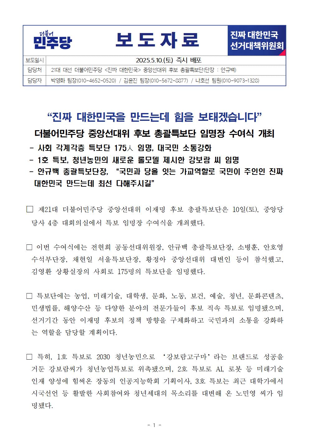 토, 2025/05/10- 00:00 에 admin 에 의해 제출됨 [0] 관련 개인/그룹 민주당 중앙당 정당 더불어민주당 지역 미특정 카테고리 보도자료 250510_총괄특보단_보도자료_총괄특보단_임명장_수여식_개최.pdf공유 공유하기 닫기페이스북트위터카카오톡URL 복사 링크 https://theminjoo.kr/main/sub/news/view.php?sno=0&brd=188&post=1211195&search= Like 0 Dislike 0 댓글 달기 이름 제목 Comment 저장 Preview