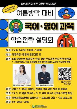 광명시청소년재단 (이사장 박승원) 청소년진로진학지원센터는 2025년도 여름방학을 앞두고 6월 14일 토요일 오후 1시부터 광명극장에서 ‘국어, 영어 교과목에 대한 학습전략 진학 설명회’를 개최한다고 밝혔다.이번 설명회는 관내 17~19세 청소년을 대상으로 국어와 영어 교과목에 대한 2026학년도 수능과 앞으로의 수능을 미리 대비하여 효과적인 입시 전략을 수립하는 데 도움을 주기 위해 마련됐다. 설명회 강사는 ▲EBS I 국어를 대표하는 최서희 선생님과 ▲EBS I 영어를 대표하는 정승익 선생님이 각 교과목에 대한 학습전략 방법에 대