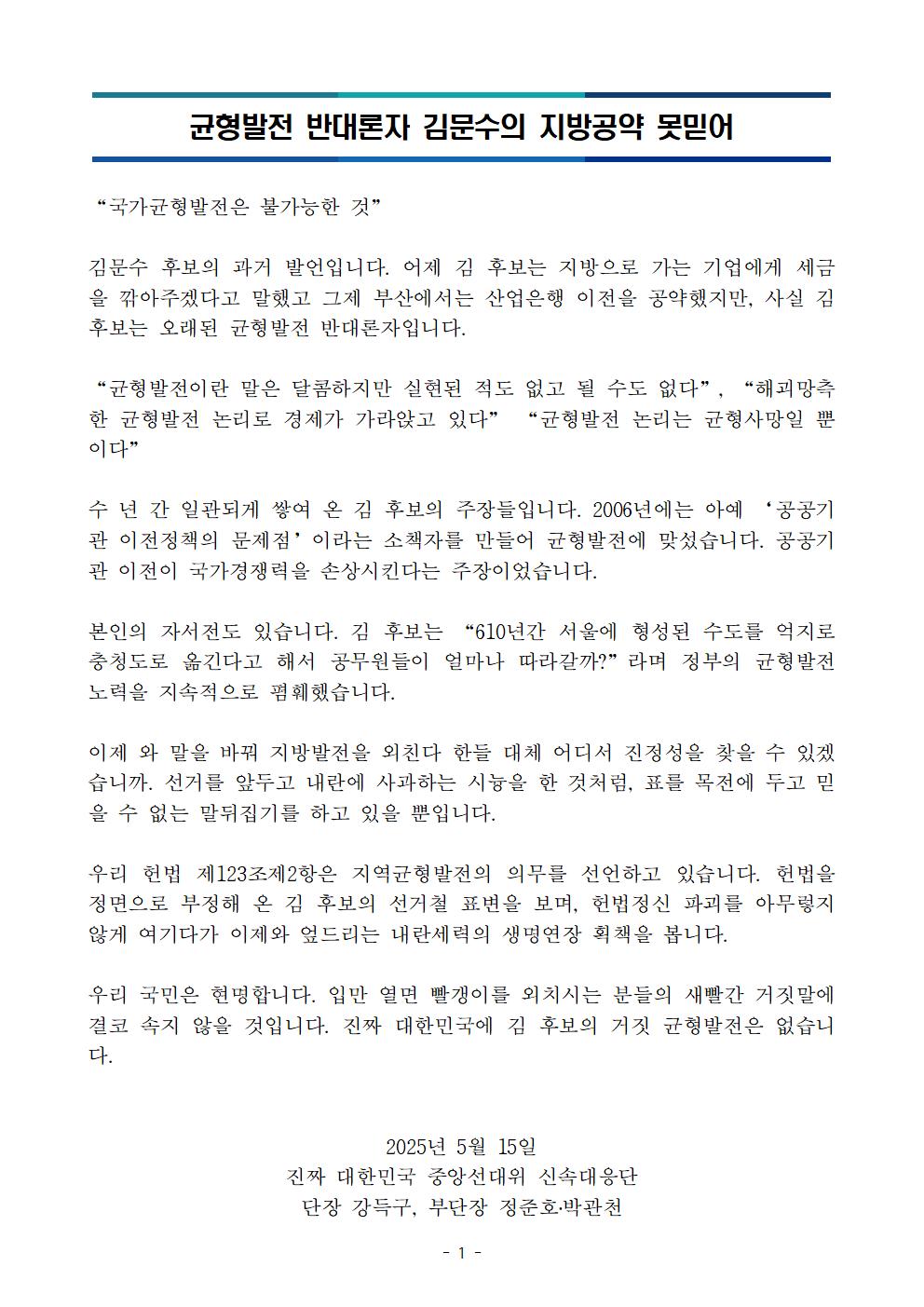 목, 2025/05/15- 00:00 에 admin 에 의해 제출됨 [0] 관련 개인/그룹 민주당 중앙당 정당 더불어민주당 지역 미특정 카테고리 보도자료 250515_균형발전_반대론자_김문수의_지방공약_못믿어.pdf공유 공유하기 닫기페이스북트위터카카오톡URL 복사 링크 https://theminjoo.kr/main/sub/news/view.php?sno=0&brd=188&post=1211349&search= Like 0 Dislike 0 댓글 달기 이름 제목 Comment 저장 Preview
