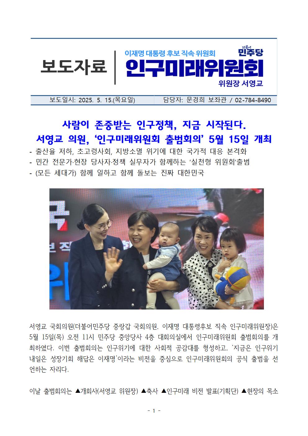 목, 2025/05/15- 00:00 에 admin 에 의해 제출됨 [0] 관련 개인/그룹 민주당 중앙당 정당 더불어민주당 지역 미특정 카테고리 보도자료 250515 인구위 보도자료(완료)_사진.pdf공유 공유하기 닫기페이스북트위터카카오톡URL 복사 링크 https://theminjoo.kr/main/sub/news/view.php?sno=0&brd=188&post=1211360&search= Like 0 Dislike 0 댓글 달기 이름 제목 Comment 저장 Preview