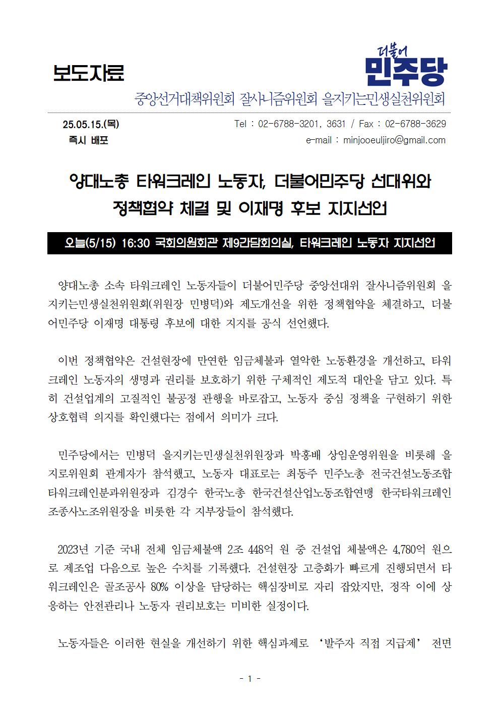 목, 2025/05/15- 00:00 에 admin 에 의해 제출됨 [0] 관련 개인/그룹 민주당 중앙당 정당 더불어민주당 지역 미특정 카테고리 보도자료 250515_보도자료_선대위_을지키는민생실천위원회_타워크레인노동자_정책협약_및_지지선언_fn.pdf공유 공유하기 닫기페이스북트위터카카오톡URL 복사 링크 https://theminjoo.kr/main/sub/news/view.php?sno=0&brd=188&post=1211388&search= Like 0 Dislike 0 댓글 달기 이름 제목 Comment 저장 Preview