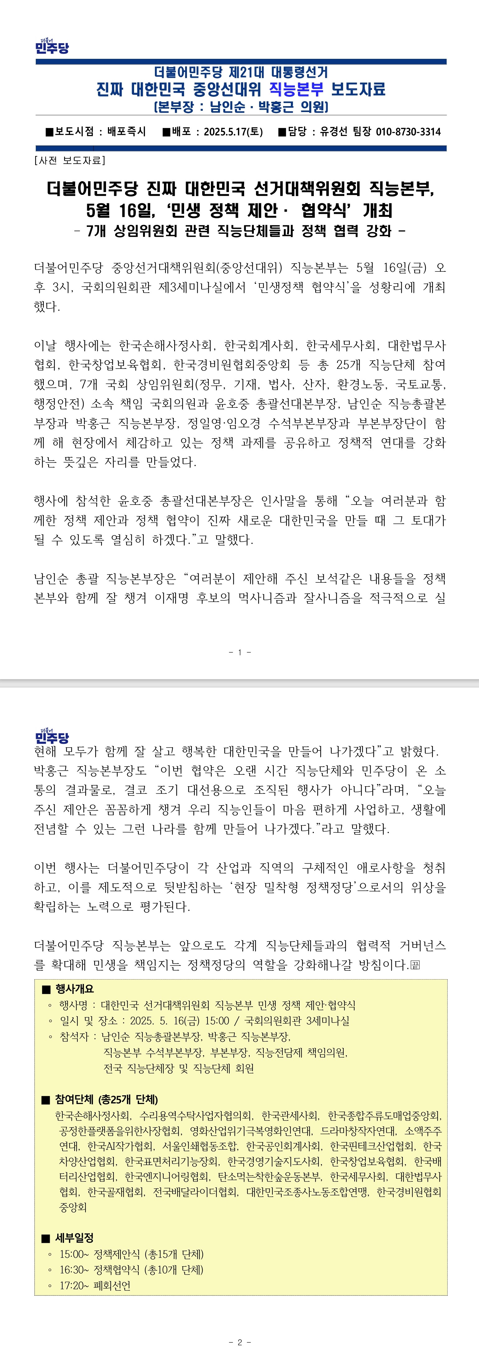 토, 2025/05/17- 00:00 에 admin 에 의해 제출됨 [0] 관련 개인/그룹 민주당 중앙당 정당 더불어민주당 지역 미특정 카테고리 보도자료 0516_직능본부_보도자료_민생정책_협약식_성공개최v2.pdf공유 공유하기 닫기페이스북트위터카카오톡URL 복사 링크 https://theminjoo.kr/main/sub/news/view.php?sno=0&brd=188&post=1211442&search= Like 0 Dislike 0 1 view 댓글 달기 이름 제목 Comment 저장 Preview