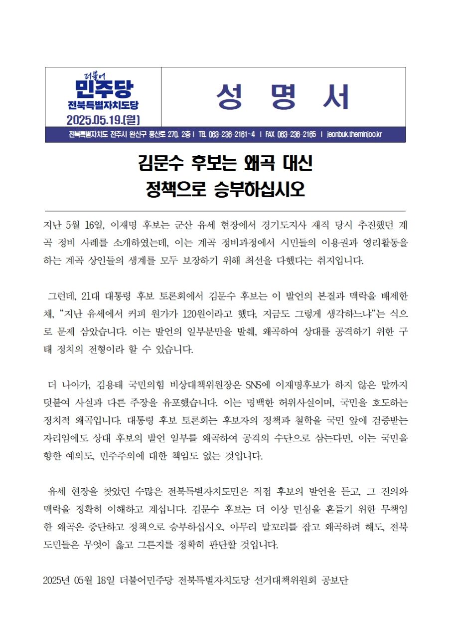 월, 2025/05/19- 00:00 에 admin 에 의해 제출됨 [0] 관련 개인/그룹 민주당 전북도당 정당 더불어민주당 지역 전북 카테고리 보도자료·성명·논평 250519_성명서_김문수후보_토론회_왜곡발언_관련_v1.0.hwp 링크 https://jeonbuk.theminjoo.kr/party/sub/news/view.php?brd=60&post=1750&board_id=briefing Like 0 Dislike 0 댓글 달기 이름 제목 Comment 저장 Preview