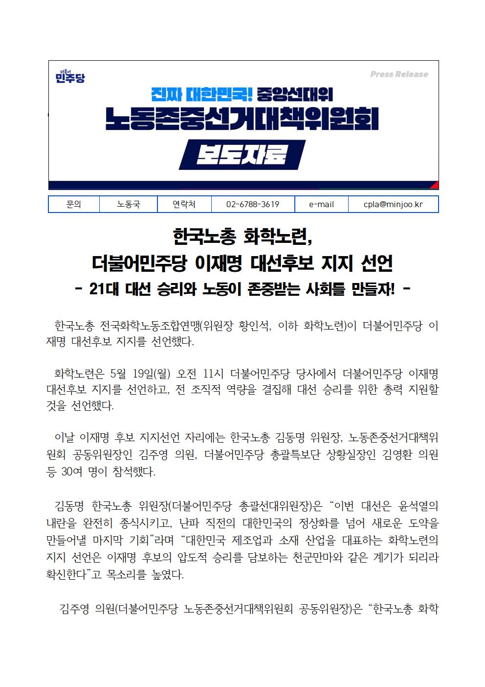 월, 2025/05/19- 00:00 에 admin 에 의해 제출됨 [0] 관련 개인/그룹 민주당 중앙당 정당 더불어민주당 지역 미특정 카테고리 보도자료 250519_노동존중선대위_보도자료_한국노총_화학노련_지지선언.pdf공유 공유하기 닫기페이스북트위터카카오톡URL 복사 링크 https://theminjoo.kr/main/sub/news/view.php?sno=0&brd=188&post=1211525&search= Like 0 Dislike 0 댓글 달기 이름 제목 Comment 저장 Preview