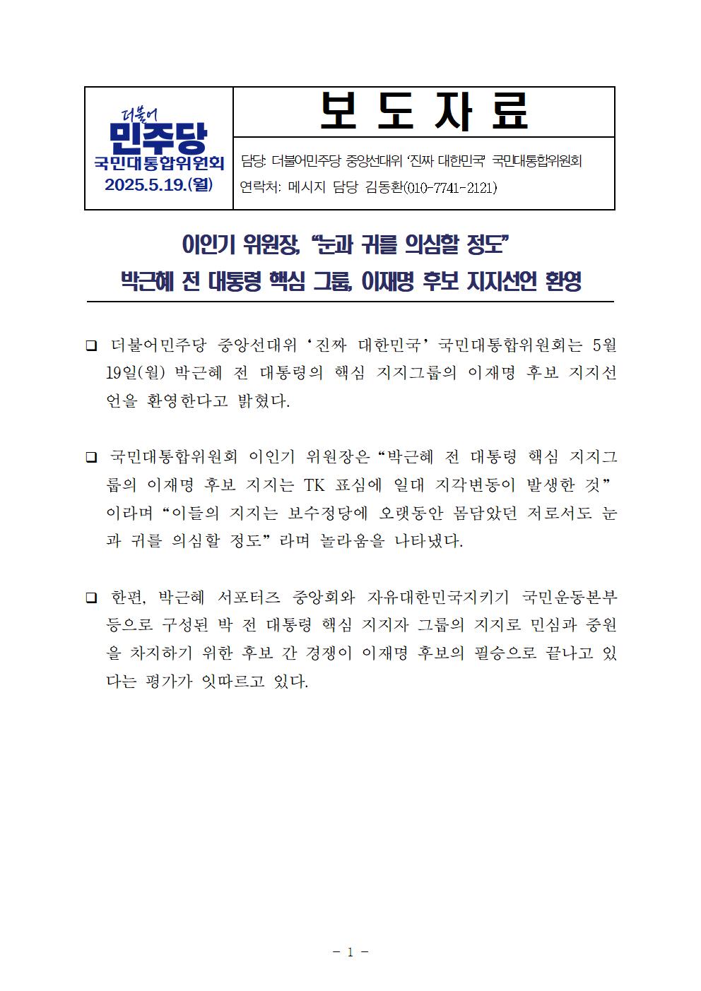 월, 2025/05/19- 00:00 에 admin 에 의해 제출됨 [0] 관련 개인/그룹 민주당 중앙당 정당 더불어민주당 지역 미특정 카테고리 보도자료 250519_보도자료_국민대통합위원회_박근혜_핵심그룹_지지선언_환영_2.pdf공유 공유하기 닫기페이스북트위터카카오톡URL 복사 링크 https://theminjoo.kr/main/sub/news/view.php?sno=0&brd=188&post=1211523&search= Like 0 Dislike 0 댓글 달기 이름 제목 Comment 저장 Preview