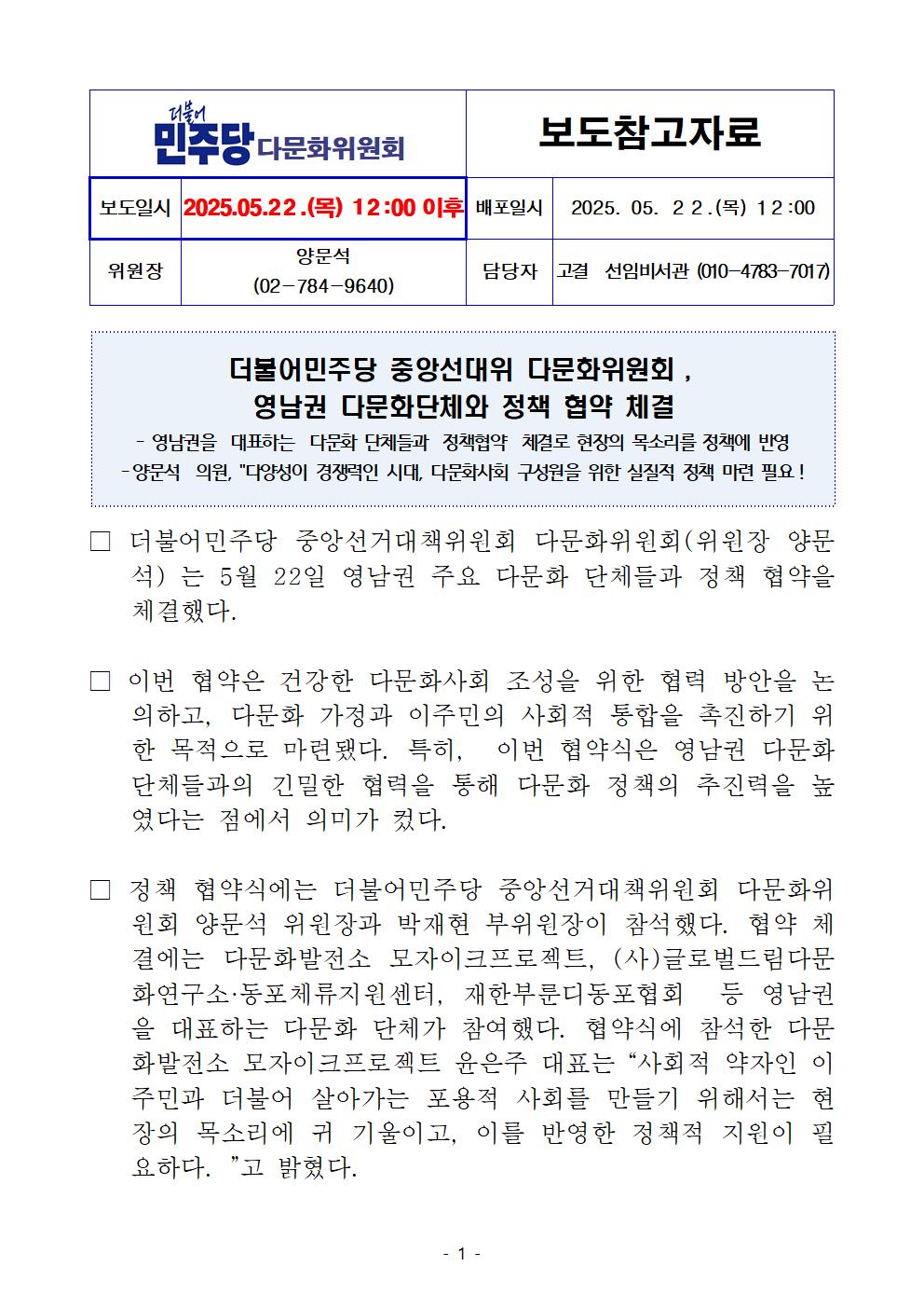 목, 2025/05/22- 00:00 에 admin 에 의해 제출됨 [0] 관련 개인/그룹 민주당 중앙당 정당 더불어민주당 지역 미특정 카테고리 보도자료 250522_다문화위_보도자료_영남권_다문화단체_정책_협약.pdf공유 공유하기 닫기페이스북트위터카카오톡URL 복사 링크 https://theminjoo.kr/main/sub/news/view.php?sno=0&brd=188&post=1211699&search= Like 0 Dislike 0 댓글 달기 이름 제목 Comment 저장 Preview