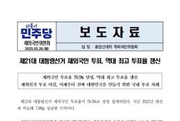 월, 2025/05/26- 00:00 에 admin 에 의해 제출됨 관련 개인/그룹 민주당 중앙당 정당 더불어민주당 지역 미특정 카테고리 보도자료 250526_재외국민위_보도자료_제21대_대통령선거_재외국민_투표_역대_최고_투표율_갱신.pdf공유 공유하기 닫기페이스북트위터카카오톡URL 복사 링크 https://theminjoo.kr/main/sub/news/view.php?sno=0&brd=188&post=1211899&search= Like 0 Dislike 0 댓글 달기 이름 제목 Comment 저장 Preview Leave this field blank