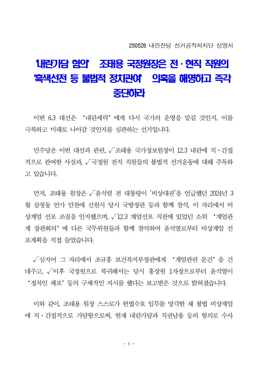 수, 2025/05/28- 00:00 에 admin 에 의해 제출됨 [0] 관련 개인/그룹 민주당 중앙당 정당 더불어민주당 지역 미특정 카테고리 보도자료 250528_내란잔당 선거공작저지단 성명서_V2.pdf공유 공유하기 닫기페이스북트위터카카오톡URL 복사 링크 https://theminjoo.kr/main/sub/news/view.php?sno=0&brd=188&post=1212018&search= Like 0 Dislike 0 댓글 달기 이름 제목 Comment 저장 Preview