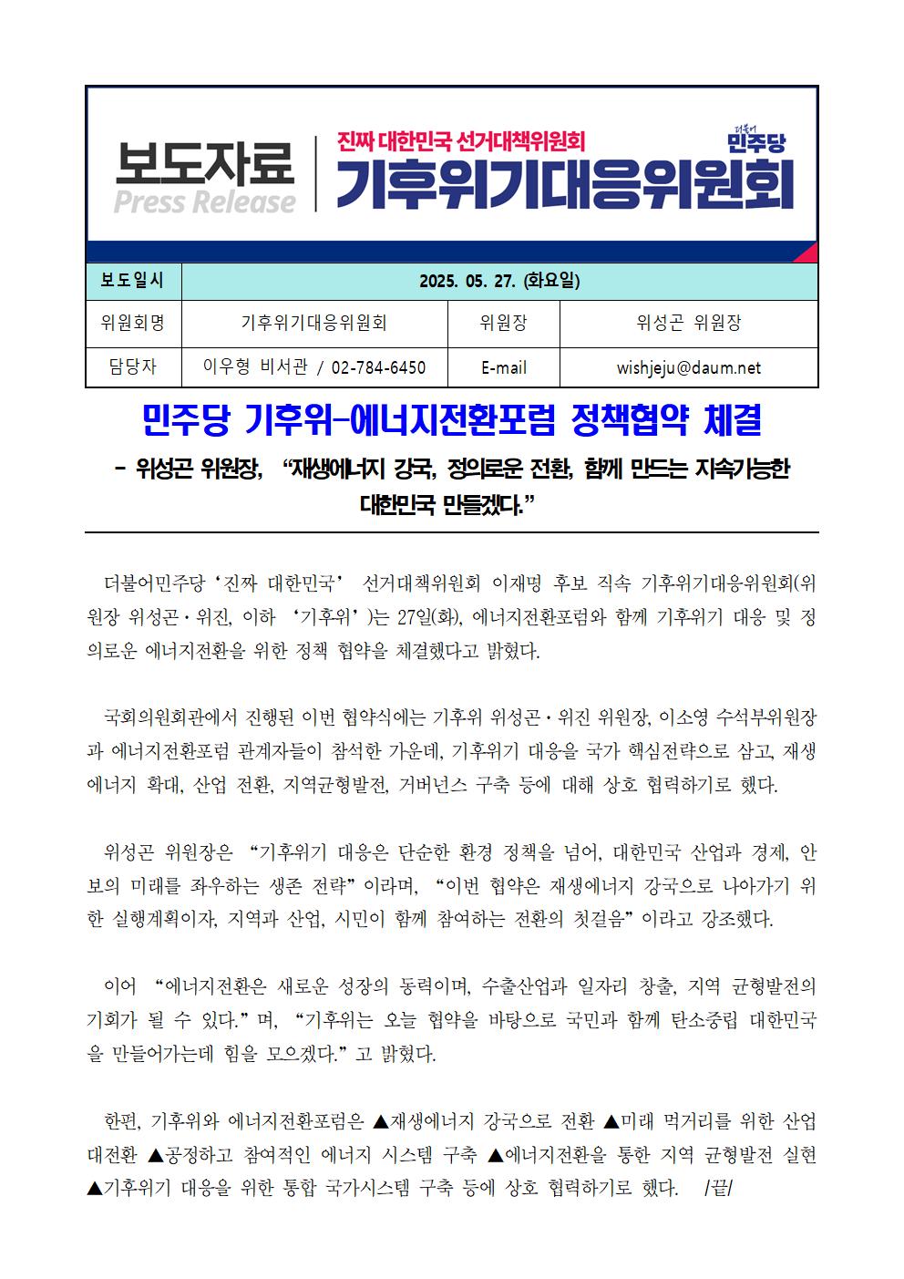 화, 2025/05/27- 00:00 에 admin 에 의해 제출됨 [0] 관련 개인/그룹 민주당 중앙당 정당 더불어민주당 지역 미특정 카테고리 보도자료 250527_기후위기대응위_보도자료_에너지전환포럼_정책_협약.pdf공유 공유하기 닫기페이스북트위터카카오톡URL 복사 링크 https://theminjoo.kr/main/sub/news/view.php?sno=0&brd=188&post=1211995&search= Like 0 Dislike 0 댓글 달기 이름 제목 Comment 저장 Preview