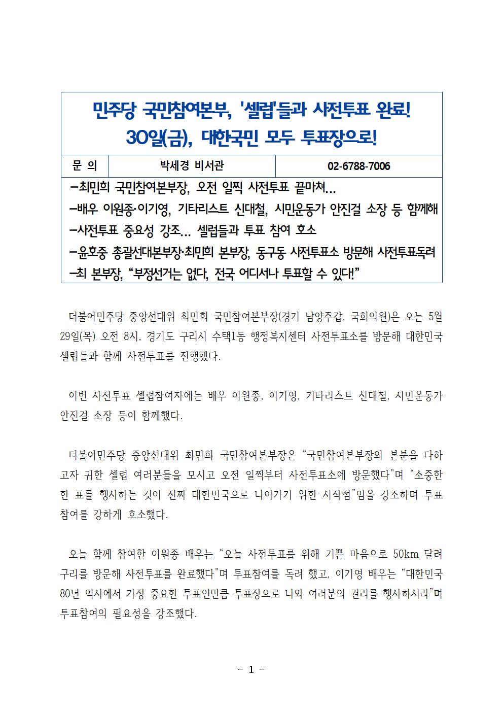 목, 2025/05/29- 00:00 에 admin 에 의해 제출됨 [0] 관련 개인/그룹 민주당 중앙당 정당 더불어민주당 지역 미특정 카테고리 보도자료 250529_국민참여본부_보도자료_최민희_본부장_및_셀럽_참여자_사전투표_진행.pdf공유 공유하기 닫기페이스북트위터카카오톡URL 복사 링크 https://theminjoo.kr/main/sub/news/view.php?sno=0&brd=188&post=1212113&search= Like 0 Dislike 0 댓글 달기 이름 제목 Comment 저장 Preview