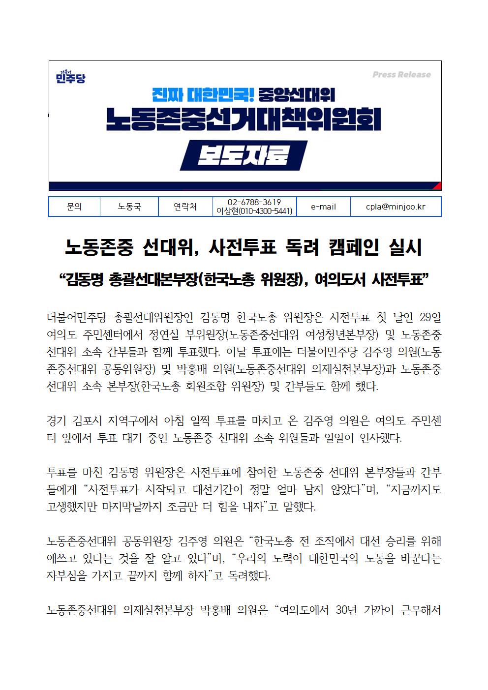 목, 2025/05/29- 00:00 에 admin 에 의해 제출됨 [0] 관련 개인/그룹 민주당 중앙당 정당 더불어민주당 지역 미특정 카테고리 보도자료 250529_노동존중선대위_보도자료_사전투표_독려_캠페인_실시.pdf공유 공유하기 닫기페이스북트위터카카오톡URL 복사 링크 https://theminjoo.kr/main/sub/news/view.php?sno=0&brd=188&post=1212127&search= Like 0 Dislike 0 댓글 달기 이름 제목 Comment 저장 Preview