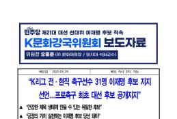 목, 2025/05/29- 00:00 에 admin 에 의해 제출됨 관련 개인/그룹 민주당 중앙당 정당 더불어민주당 지역 미특정 카테고리 보도자료 250529_K문화강국위원회_보도자료_K리그_전·현직_축구선수_31명_지지_선언.pdf공유 공유하기 닫기페이스북트위터카카오톡URL 복사 링크 https://theminjoo.kr/main/sub/news/view.php?sno=0&brd=188&post=1212138&search= Like 0 Dislike 0 1 view 댓글 달기 이름 제목 Comment 저장 Preview Leave this field blank