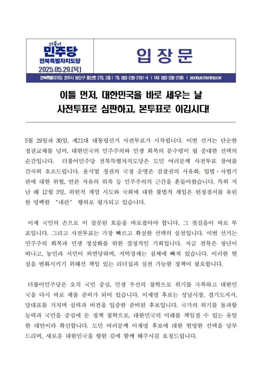 목, 2025/05/29- 00:00 에 admin 에 의해 제출됨 [0] 관련 개인/그룹 민주당 전북도당 정당 더불어민주당 지역 전북 카테고리 보도자료·성명·논평 250528_입장문_사전투표_이재명후보_지지호소_v1.0.hwp 링크 https://jeonbuk.theminjoo.kr/party/sub/news/view.php?brd=60&post=1832&board_id=briefing Like 0 Dislike 0 1 view 댓글 달기 이름 제목 Comment 저장 Preview