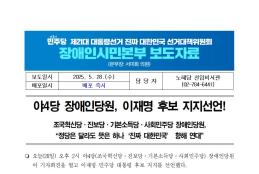 수, 2025/05/28- 00:00 에 admin 에 의해 제출됨 관련 개인/그룹 민주당 중앙당 정당 더불어민주당 지역 미특정 카테고리 보도자료 250528_장애인시민본부_보도자료_야4당_장애인당원_지지_선언.pdf공유 공유하기 닫기페이스북트위터카카오톡URL 복사 링크 https://theminjoo.kr/main/sub/news/view.php?sno=0&brd=188&post=1212065&search= Like 0 Dislike 0 댓글 달기 이름 제목 Comment 저장 Preview Leave this field blank