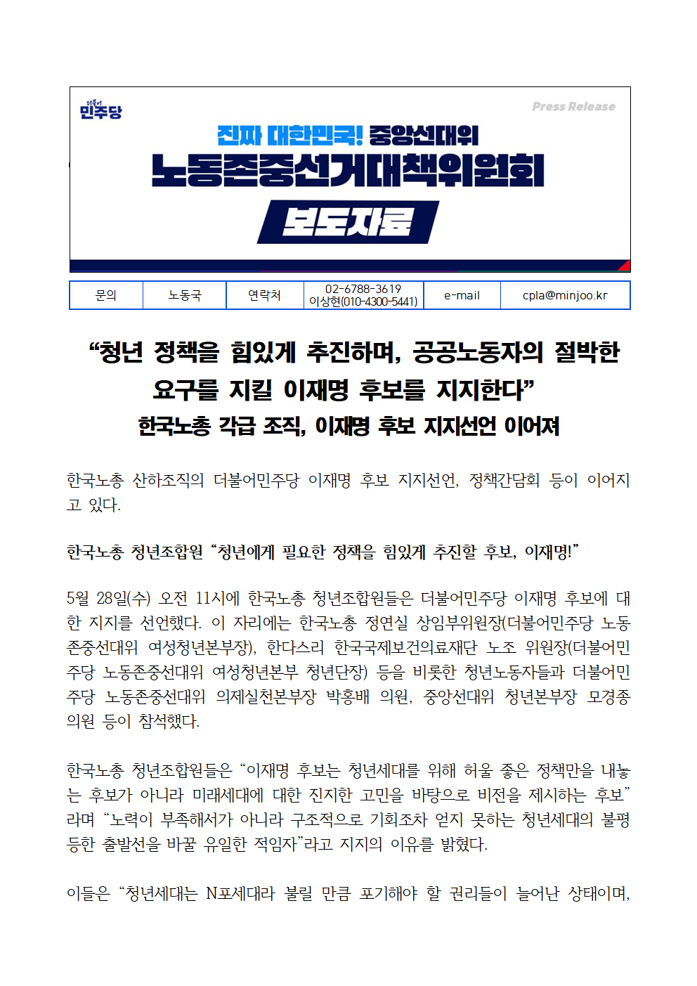 수, 2025/05/28- 00:00 에 admin 에 의해 제출됨 [0] 관련 개인/그룹 민주당 중앙당 정당 더불어민주당 지역 미특정 카테고리 보도자료 250528_노동존중선대위_보도자료_한국노총_청년조합원_지지_선언_공공노련_정책협약_및_지지_선언_등.pdf공유 공유하기 닫기페이스북트위터카카오톡URL 복사 링크 https://theminjoo.kr/main/sub/news/view.php?sno=0&brd=188&post=1212076&search= Like 0 Dislike 0 댓글 달기 이름 제목 Comment 저장 Preview