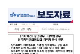 수, 2025/05/28- 00:00 에 admin 에 의해 제출됨 관련 개인/그룹 민주당 중앙당 정당 더불어민주당 지역 미특정 카테고리 보도자료 250528_청년본부대학생본부_보도자료_전국총학생회협의회_정책제안식.pdf공유 공유하기 닫기페이스북트위터카카오톡URL 복사 링크 https://theminjoo.kr/main/sub/news/view.php?sno=0&brd=188&post=1212026&search= Like 0 Dislike 0 댓글 달기 이름 제목 Comment 저장 Preview Leave this field blank