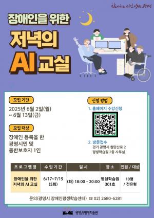 광명시(시장 박승원) 평생학습원은 오는 13일까지 장애인 학습자의 디지털 창작 역량 향상을 위한 ‘저녁의 AI교실’ 참여자를 모집한다.‘저녁의 AI교실’은 누구나 쉽게 체험할 수 있는 초급 중심 강의로, 인공지능(AI)를 활용한 이미지와 영상 제작, 유튜브 채널 운영 등 실습 위주의 프로그램으로 구성했다.수업은 인공지능과 대화, 이미지 생성 실습, 이미지 프롬프트를 활용한 사진 제작, 인공지능 기반 영상 제작과 편집, 유튜브 채널 개설과 영상 업로드 순으로 진행한다.특히 평일 낮 시간 참여가 어려운 시민을 고려해 화요일 저녁 6시에