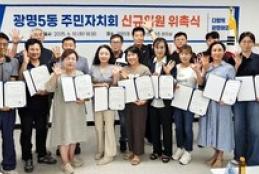 광명5동 주민자치회(회장 심현숙)는 지난 10일 을 개최했다고 밝혔다.이날 위촉식에는 하태화 자치행정국장, 주민자치회 위원, 관계 공무원 등 50여 명이 참석했으며, 신규위원 소개와 위촉장 전달, 인사말 등이 진행됐다.이번에 19명의 신규 위원이 추가로 위촉되면서 광명5동 주민자치회는 총 41명으로 구성됐다. 이들은 임기 동안 ▲마을 의제 발굴과 계획 수립 ▲주민총회 개최 ▲주민자치회 활성화 사업 등 다양한 활동으로 주민을 대표하고, 행복하고 살기 좋은 마을 만들기에 앞장설 예