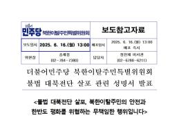 월, 2025/06/16- 00:00 에 admin 에 의해 제출됨 관련 개인/그룹 민주당 중앙당 정당 더불어민주당 지역 미특정 카테고리 보도자료 250616_민주당_북한이탈주민특위_성명서_보도자료.pdf공유 공유하기 닫기페이스북트위터카카오톡URL 복사 링크 https://theminjoo.kr/main/sub/news/view.php?sno=0&brd=188&post=1212401&search= Like 0 Dislike 0 댓글 달기 이름 제목 Comment 저장 Preview Leave this field blank