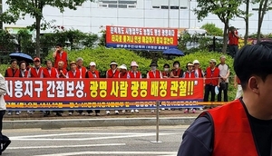 3기 신도시 광명시흥지구 광명총주민대책위원회(위원장 윤승모)는 지난 17일(화) 오전 한국토지주택공사(LH) 광명시흥사업본부 앞에서 3기 신도시 지구내 광명시 주민 200여 명이 참석한 가운데 향후 이주자택지, 협의 양도택지 등 ‘간접보상’의 위치 배정에 있어 광명사람은 광명시 배정을 확약할 것을 요구하는 집회를 열었다.이들이 말하는 간접보상이란 공공목적 토지 수용의 경우 직접 보상금 외에 지구내 주민 토지주의 연고지 재정착 지원 등을 위한 이주자택지/이주자주택, 협의양도택지/협의양도주택, 생활대책용지, 기업이전부지, 대토보상, 임