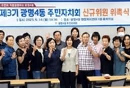 광명4동 주민자치회(회장 김만호)는 지난 16일 광명4동 행정복지센터에서 주민자치위원 3명을 추가 위촉했다고 밝혔다.제3기 주민자치회는 총 22명으로 구성됐으며, 앞으로 지역 현안 발굴, 주민세마을사업 추진, 주민총회 개최 등 다양한 자치활동으로 주민 삶의 질 향상과 지역 공동체 활성화에 힘쓸 예정이다.이날 행사에서는 신규 위원에 대한 위촉장 수여와 함께 주민자치회의 역할과 운영 방향 안내가 이뤄졌으며, 위촉식 후 6월 정기회의를 열어 하반기 사업 추진을 위한 협력 체계도 다졌다.최옥남 동장은 “주민자치회는 주민이 직접 참여해 마을